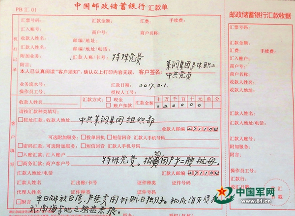 2月6日,山東省鋼鐵集團(tuán)有限公司萊鋼黨委組織部接到一張匯款單,金額為兩萬元整,簽名為“中共黨員、萊鋼集團(tuán)退休職工”,附言:“特殊黨費(fèi),捐給國(guó)產(chǎn)第二艘航母……”