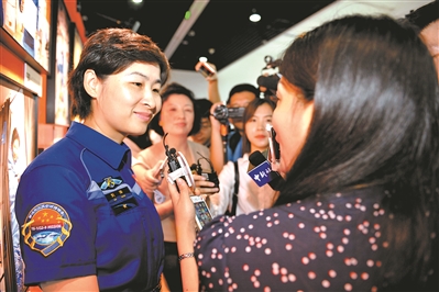 中國人民解放軍航天員大隊(duì)航天員劉洋在展覽現(xiàn)場接受媒體記者的采訪。本報記者 宋雯 攝