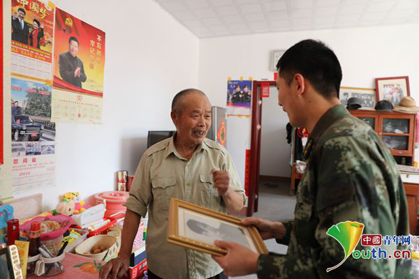 ????孟曉暉的爺爺孟慶欣也曾經(jīng)是一名解放軍戰(zhàn)士,并榮獲過獨(dú)立獎?wù)隆C慨?dāng)說起自己的從軍經(jīng)歷時,這位年過八旬的老人都十分振奮,談到繼承了“紅色基因”的兒孫時,孟慶欣老人的驕傲與自豪更是溢于言表。他說,自己經(jīng)常把當(dāng)年參軍的故事講給子孫聽,曉暉就是聽著爺爺?shù)墓适麻L大的,從小就說自己長大后也要當(dāng)兵。在唱起這首凝聚了他熱血青春與報國壯志的軍歌之前,老人嚴(yán)肅地說道:“我要換上一身整潔的軍裝!”