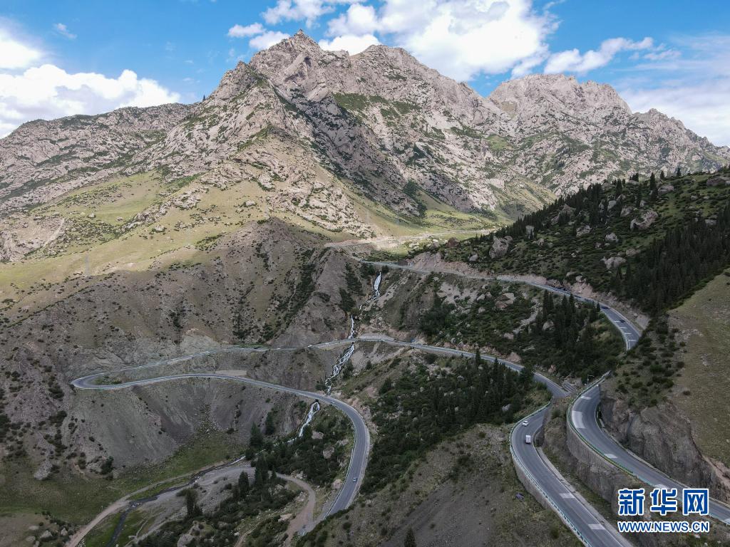 車(chē)輛行駛在新疆獨(dú)庫(kù)公路的一處盤(pán)山路段(6月20日攝,無(wú)人機(jī)照片)。