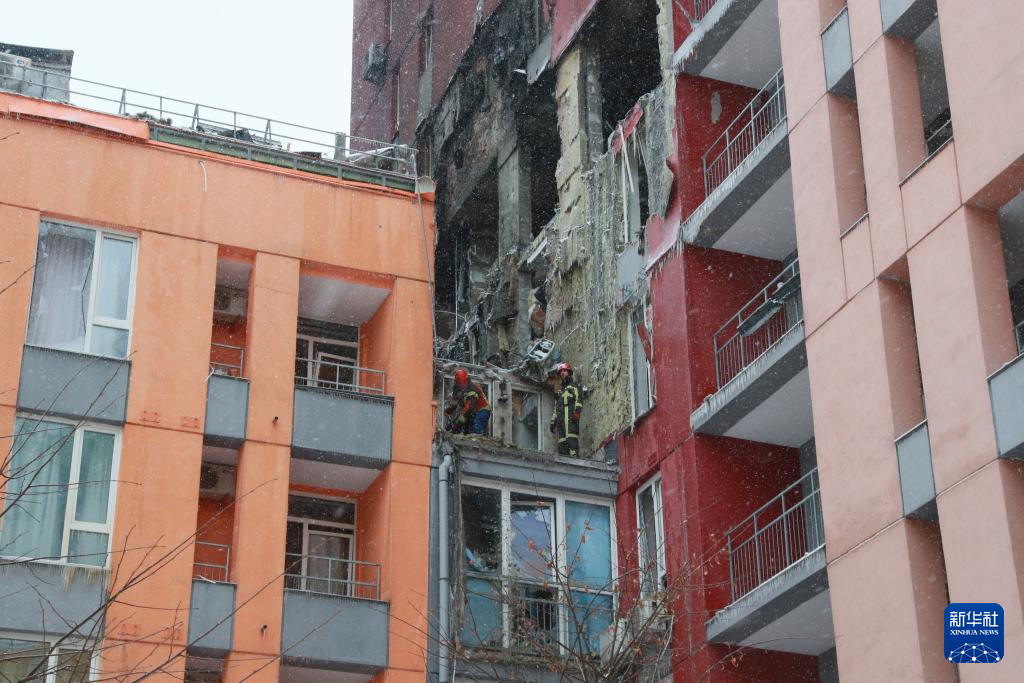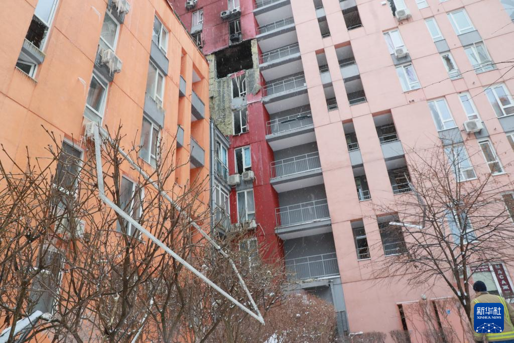 这是1月9日拍摄的被无人机击中的乌克兰首都基辅市第聂伯区一栋公寓楼。