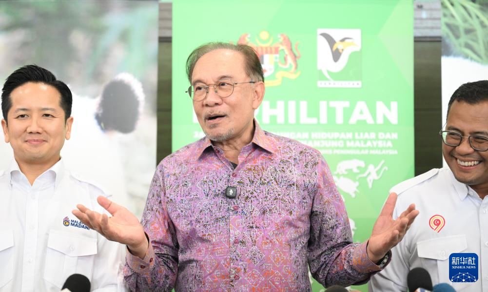 1月10日,马来西亚总理安瓦尔(中)在吉隆坡附近的马来西亚国家动物园出席相关活动并讲话。