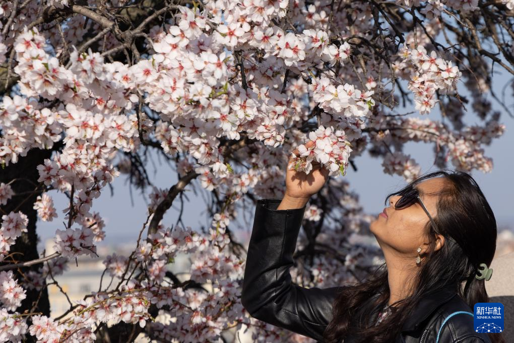 3月14日,游人在匈牙利布达佩斯观赏杏花。
