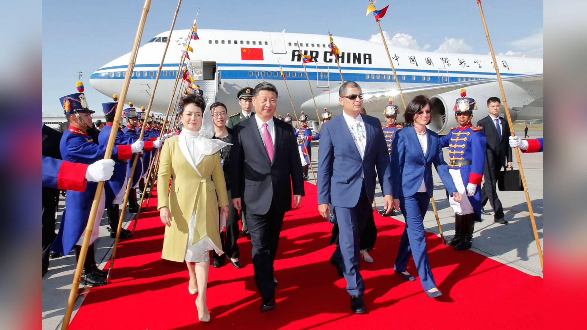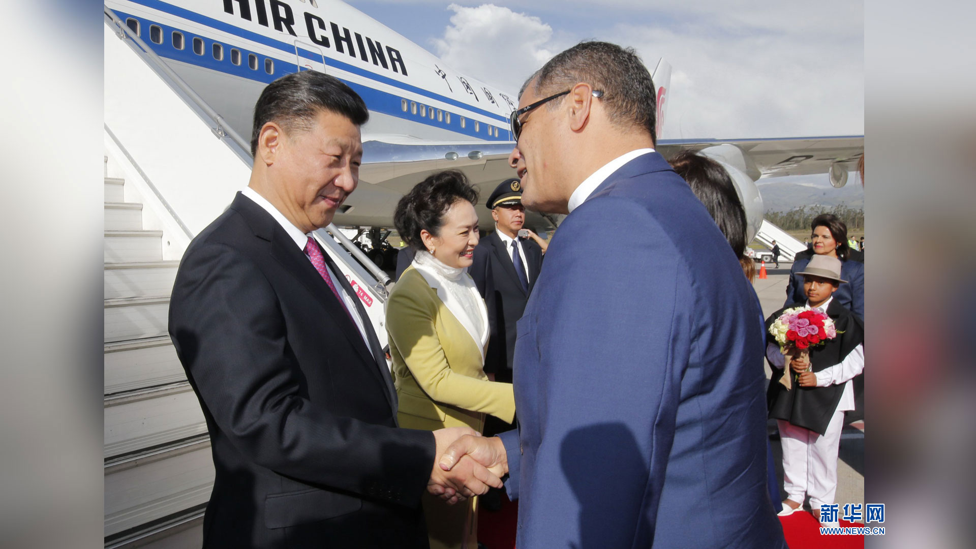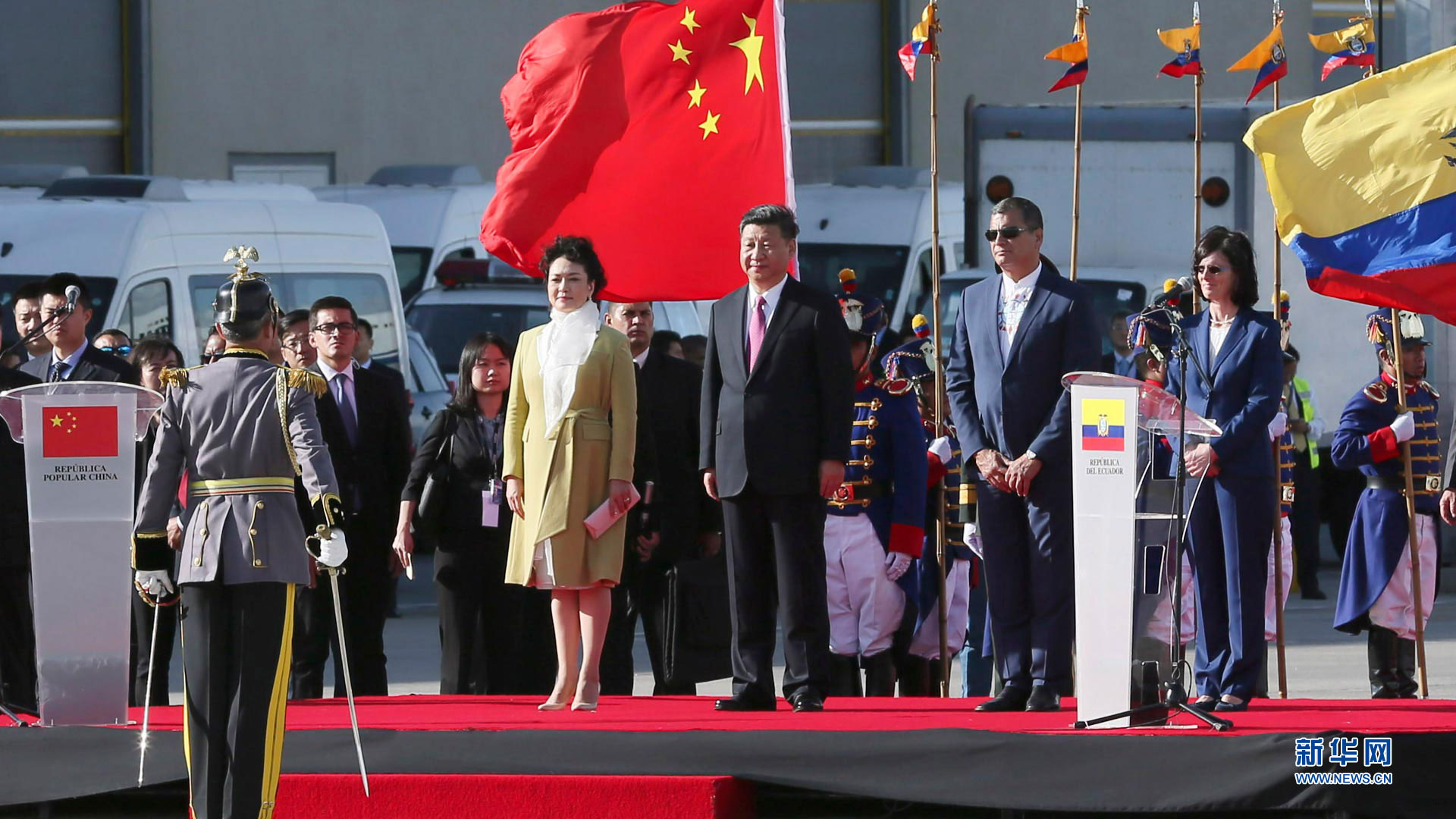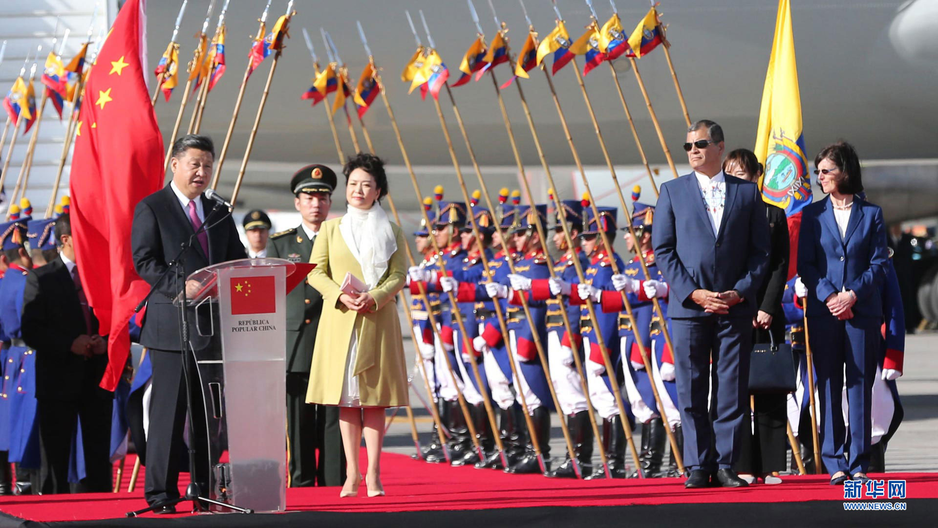 當?shù)貢r間11月17日,國家主席習(xí)近平乘專機抵達基多,開始對厄瓜多爾共和國進行國事訪問。厄瓜多爾總統(tǒng)科雷亞和夫人馬勒布等在機場熱情迎接習(xí)近平和夫人彭麗媛。新華社記者 鞠鵬 攝2016-11-18