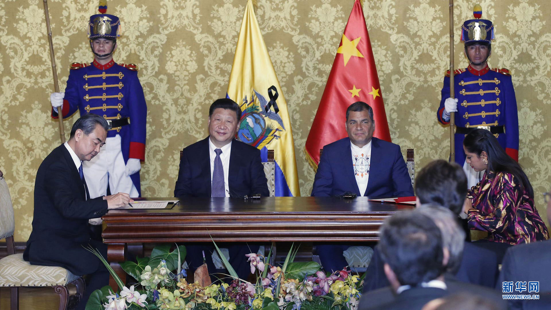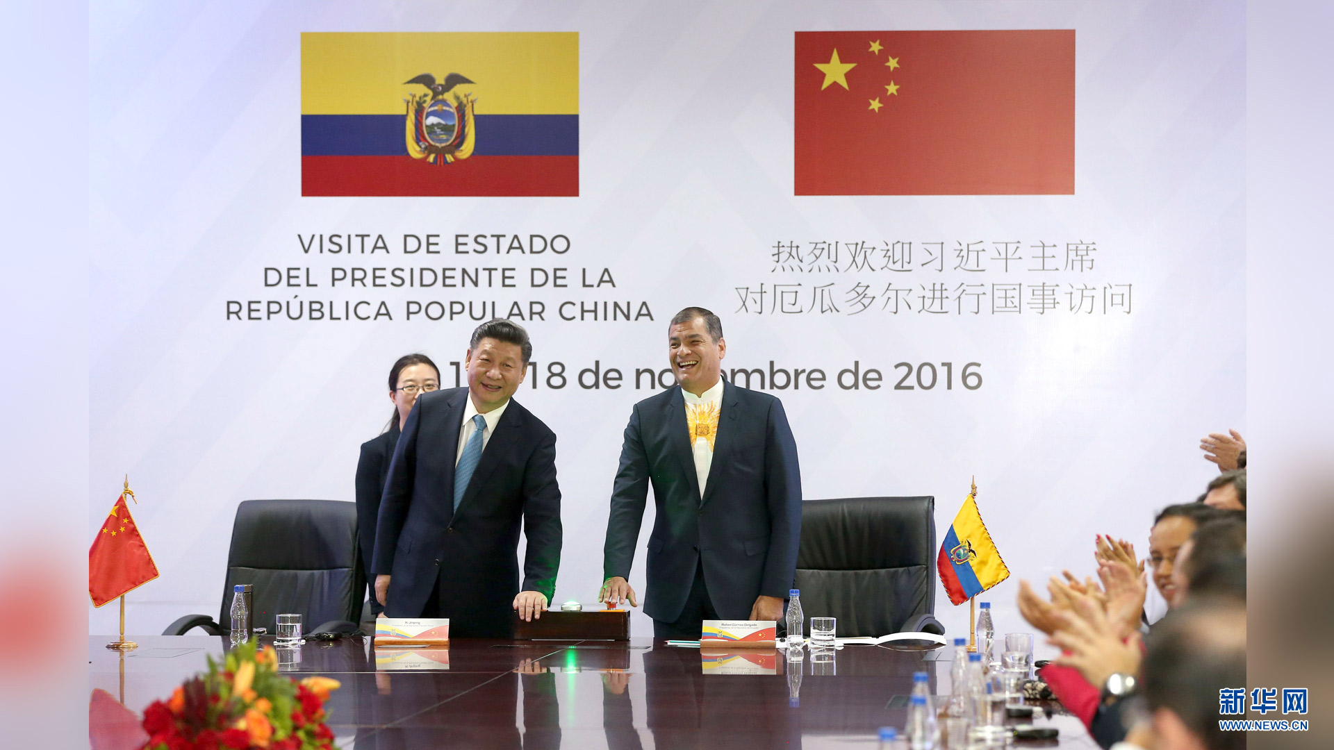 當?shù)貢r間11月17日,國家主席習(xí)近平在基多同厄瓜多爾總統(tǒng)科雷亞舉行會談。這是會談后,兩國元首見證雙邊合作文件的簽署。 新華社記者 鞠鵬攝2016-11-18