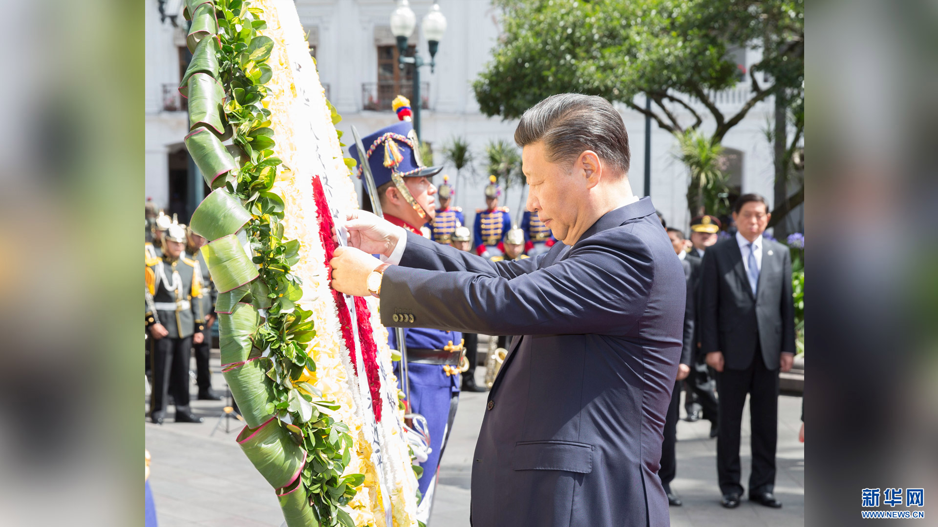 當?shù)貢r間11月18日,國家主席習(xí)近平向厄瓜多爾獨立英雄紀念碑敬獻花圈。 新華社記者 黃敬文 攝2016-11-19