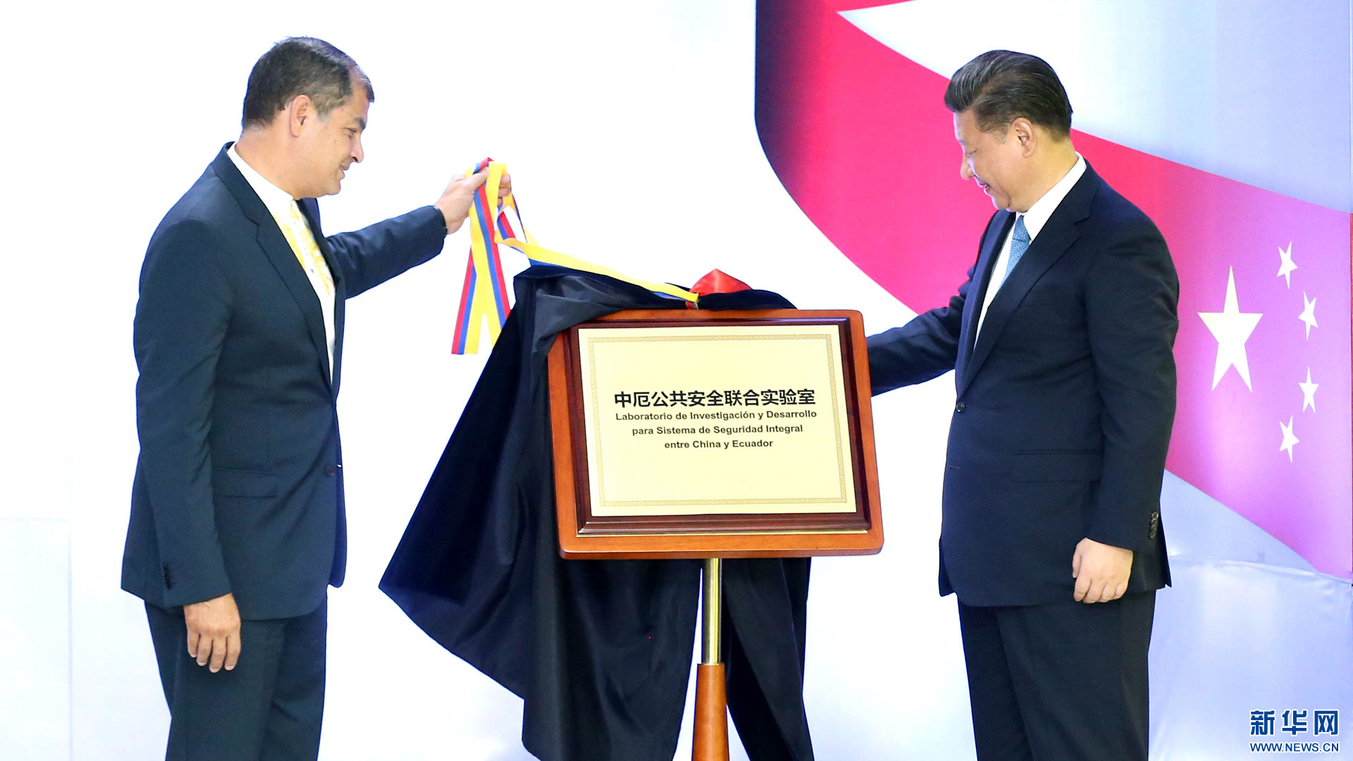 當?shù)貢r間11月18日,國家主席習(xí)近平在基多同厄瓜多爾總統(tǒng)科雷亞共同出席中方援建的厄瓜多爾公共安全應(yīng)急指揮中心聯(lián)合實驗室揭牌儀式,喬內(nèi)醫(yī)院奠基、科卡科多-辛克雷水電站竣工發(fā)電視頻連線活動。這是兩國元首共同為厄瓜多爾公共安全應(yīng)急指揮中心聯(lián)合實驗室揭牌。新華社記者 馬占成 攝2016-11-19