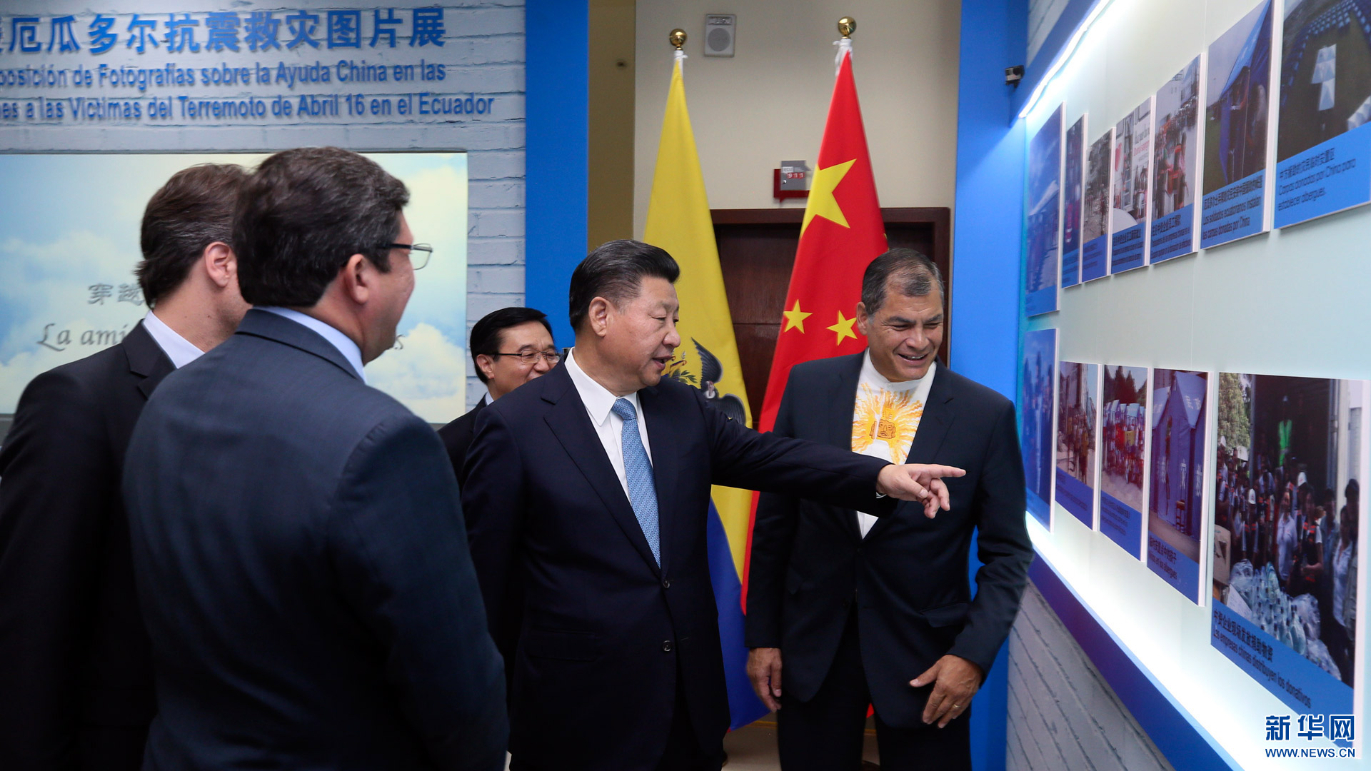 當?shù)貢r間11月18日,國家主席習(xí)近平在基多同厄瓜多爾總統(tǒng)科雷亞共同出席中方援建的厄瓜多爾公共安全應(yīng)急指揮中心聯(lián)合實驗室揭牌儀式,喬內(nèi)醫(yī)院奠基、科卡科多-辛克雷水電站竣工發(fā)電視頻連線活動。這是兩國元首共同參觀中方支援厄瓜多爾抗震救災(zāi)圖片展。新華社記者 蘭紅光 攝2016-11-19
