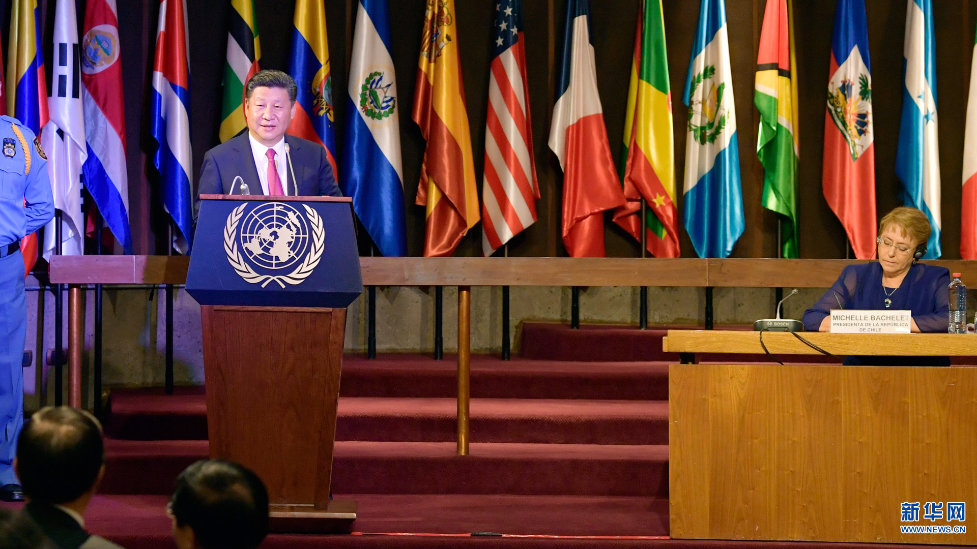 11月22日,國家主席習(xí)近平在圣地亞哥聯(lián)合國拉丁美洲和加勒比經(jīng)濟委員會總部出席中拉媒體領(lǐng)袖峰會開幕式。智利總統(tǒng)巴切萊特陪同出席。在熱烈的掌聲中,習(xí)近平發(fā)表題為《開創(chuàng)中拉媒體合作新局面》的致辭。新華社記者 鞠鵬 攝2016-11-23