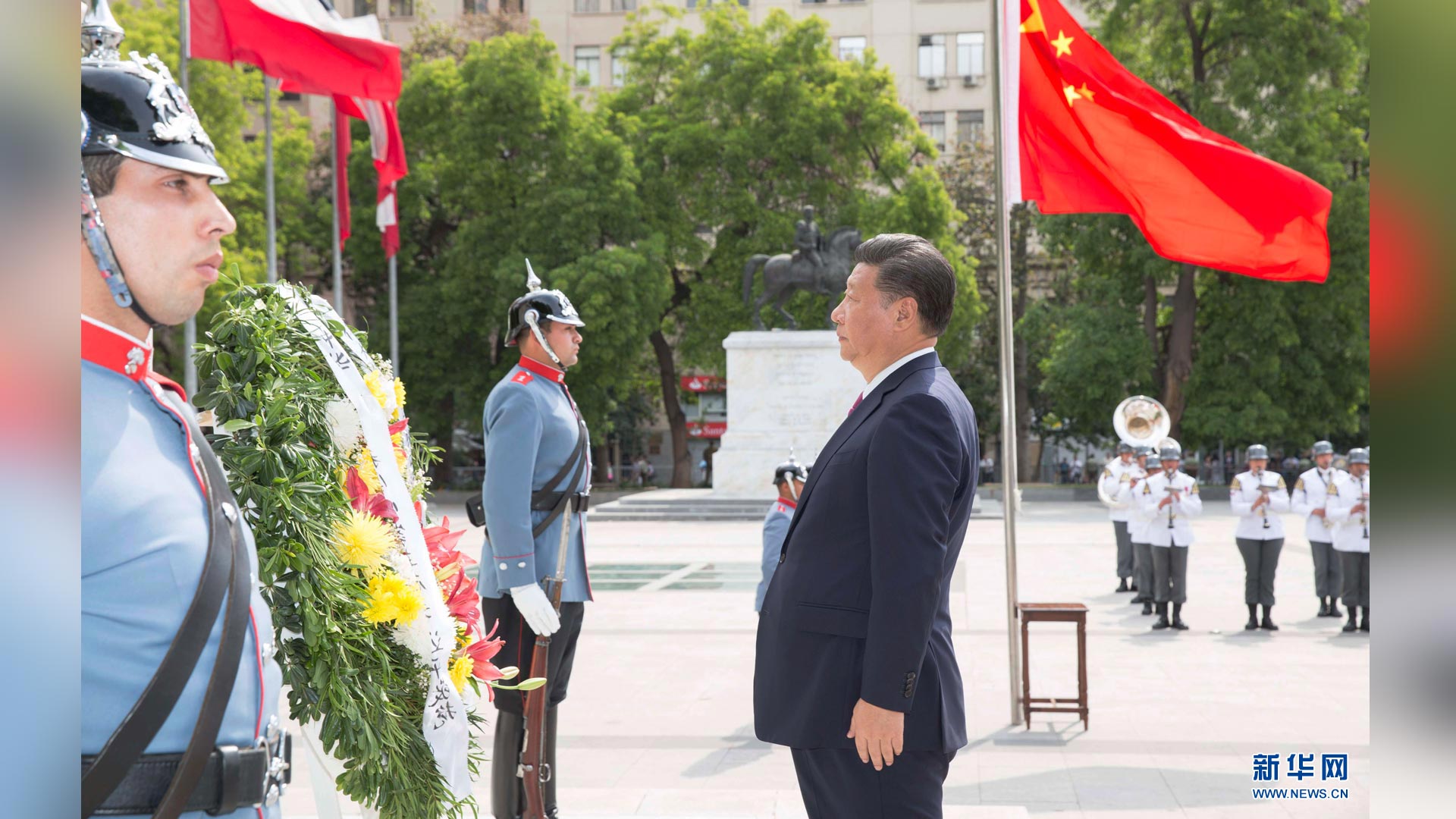 11月22日,國家主席習(xí)近平在圣地亞哥向智利解放者奧希金斯紀念碑敬獻花圈。 新華社記者 黃敬文 攝2016-11-23