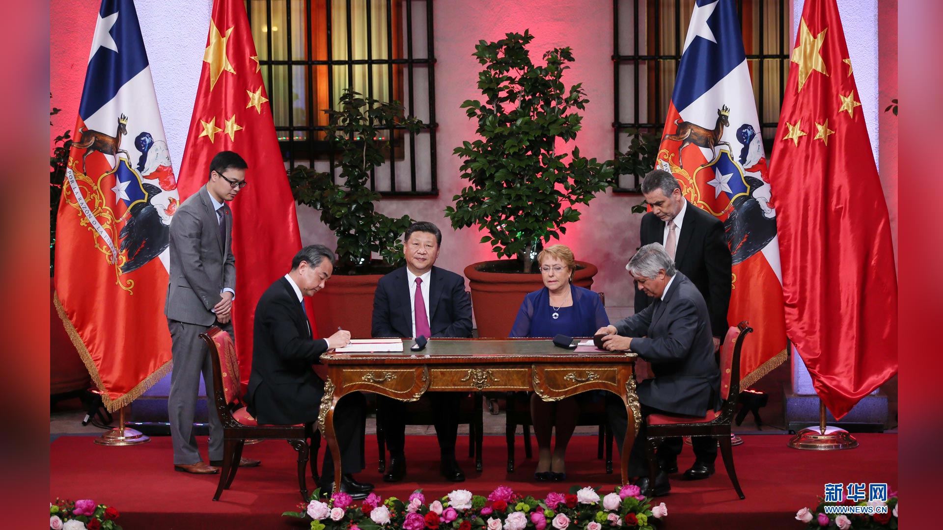 11月22日,國家主席習(xí)近平在圣地亞哥同智利總統(tǒng)巴切萊特舉行會談。這是會談后,兩國元首見證經(jīng)貿(mào)、農(nóng)業(yè)、質(zhì)檢、文化、教育、電子商務(wù)、信息通信、金融等領(lǐng)域多項雙邊合作文件的簽署。新華社記者 蘭紅光 攝2016-11-23
