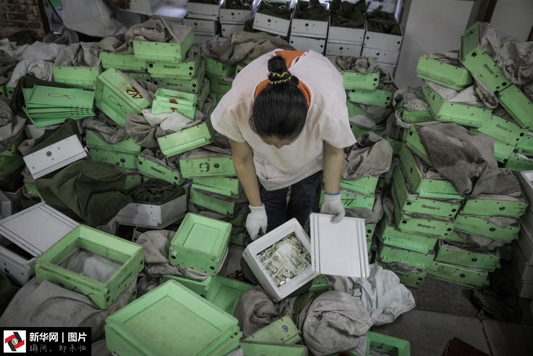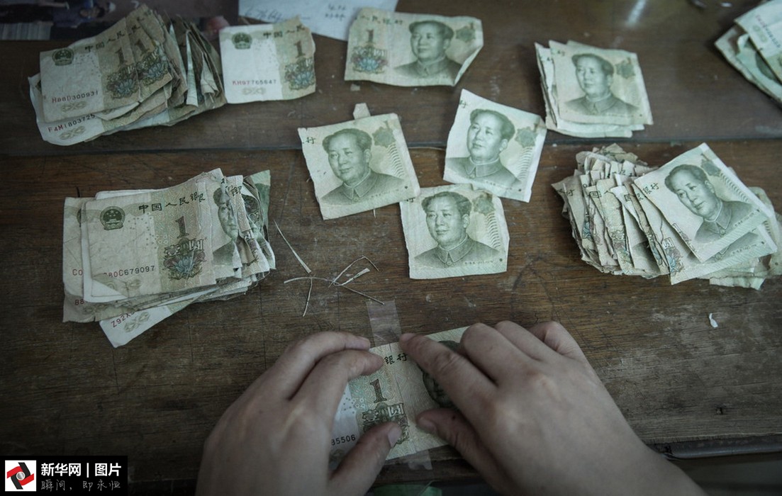 點鈔中心的員工在修補(bǔ)殘破的人民幣。