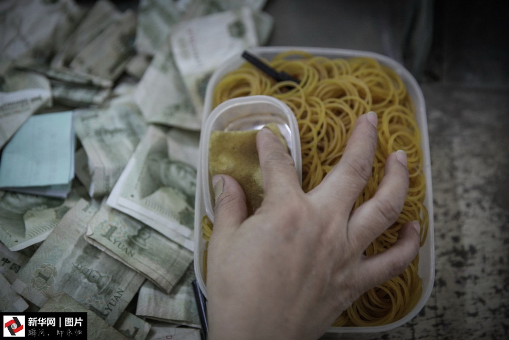 點鈔員肖冬常年累月的坐著重復(fù)數(shù)錢的動作,讓她的腰椎和頸椎常常感到不適,“轉(zhuǎn)眼間,已經(jīng)當(dāng)了20多年的點鈔員,這些年數(shù)過多少錢肯定沒有準(zhǔn)確數(shù)據(jù)了,從一天數(shù)幾百張到如今的一萬多張,是時間教會人成長?!眻D為點鈔員沾濕手指準(zhǔn)備點鈔。