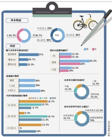 調(diào)查中,對(duì)于最喜歡的共享單車品牌(可多選),有57%的用戶表示喜歡摩拜,ofo小黃車也獲得了26.7%用戶青睞,23.3%的用戶喜歡小藍(lán)單車。