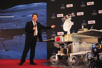 昨日,中國(guó)工程院院士、中國(guó)探月工程總設(shè)計(jì)師吳偉仁介紹嫦娥四號(hào)月球車(chē)外觀(guān)和設(shè)計(jì)。記者 倪偉 攝