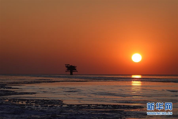 中海油錦州9-3采油平臺(tái)落日下的浮冰(1月13日攝)。新華社發(fā)(安磊 攝)