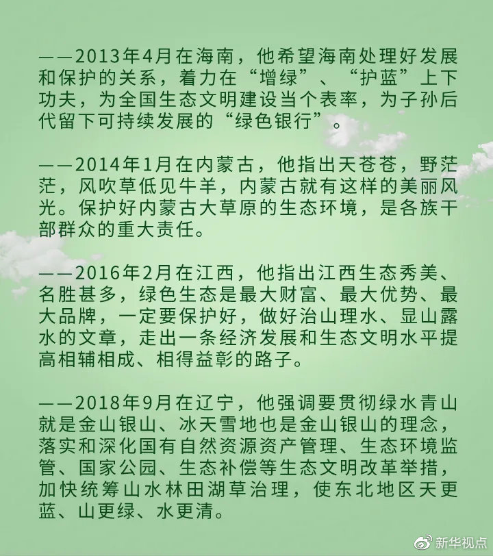 黨的十八大以來,習(xí)近平總書記多次調(diào)研考察時(shí)談到生態(tài)環(huán)境保護(hù)問題。山山水水見證了他心系中華民族永續(xù)發(fā)展的情懷。