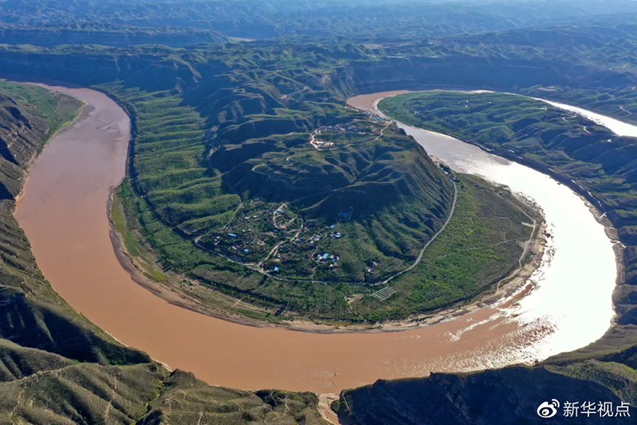 這是2019年8月28日拍攝的山西省永和縣閣底鄉(xiāng)境內(nèi)黃河乾坤灣(無(wú)人機(jī)照片)。新華社記者 曹陽(yáng) 攝