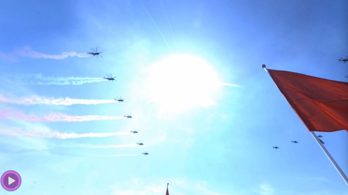 蔚藍(lán)的天空中,6架直升機(jī)護(hù)衛(wèi)著國(guó)旗和軍旗、20架直升機(jī)飛成“70”字樣、7架教練機(jī)拉出7道彩煙——率先從天安門廣場(chǎng)飛過(guò)的空中護(hù)旗方隊(duì),揭開了勝利日大閱兵的序幕。9月3日,雄偉的天安門,寬闊的長(zhǎng)安街,見證著這場(chǎng)大閱兵的一個(gè)又一個(gè)精彩瞬間。