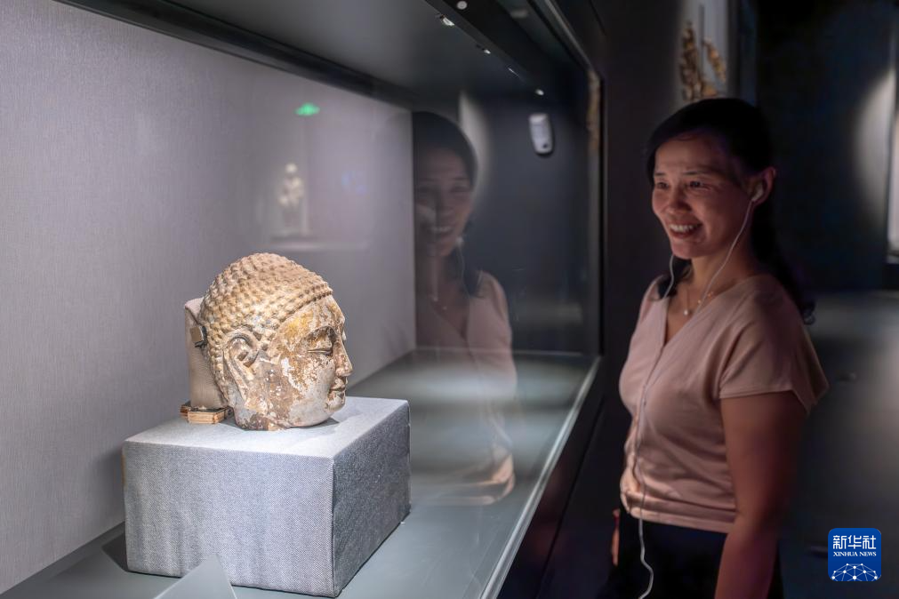 8月16日,观众在鄂尔多斯市博物院观赏建造于北齐的彩绘石雕菩萨像。