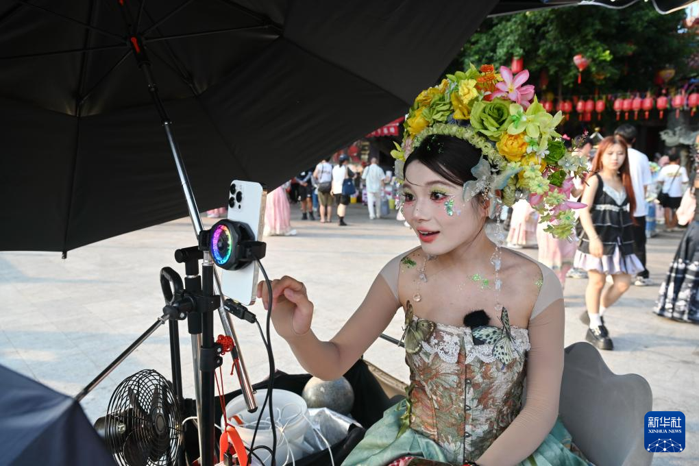8月18日,福建泉州蟳埔村,工作人员通过手机直播为游客介绍“簪花围”旅拍业务。