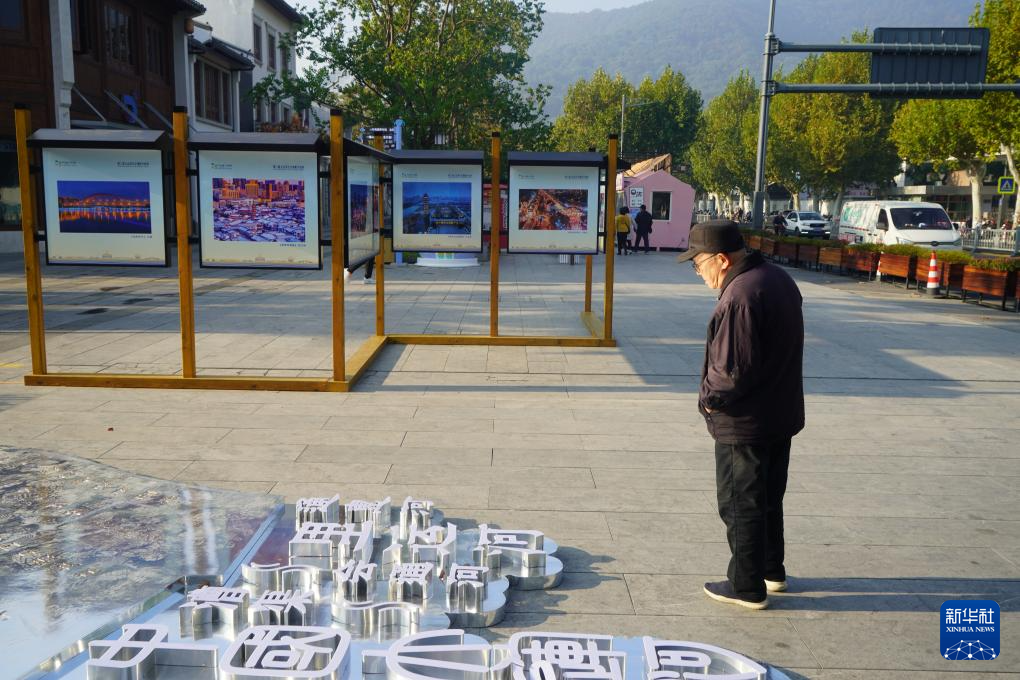 11月23日,一位老人在第二届大运河文化摄影展现场驻足参观。