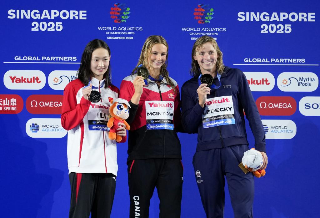 2025年7月27日,2025年世界游泳锦标赛游泳女子400米自由泳决赛在新加坡举行。图为冠军加拿大选手麦金托什(中)、亚军中国选手李冰洁(左)和季军美国选手莱德茨基在颁奖仪式上。新华社记者 伍志尊 摄