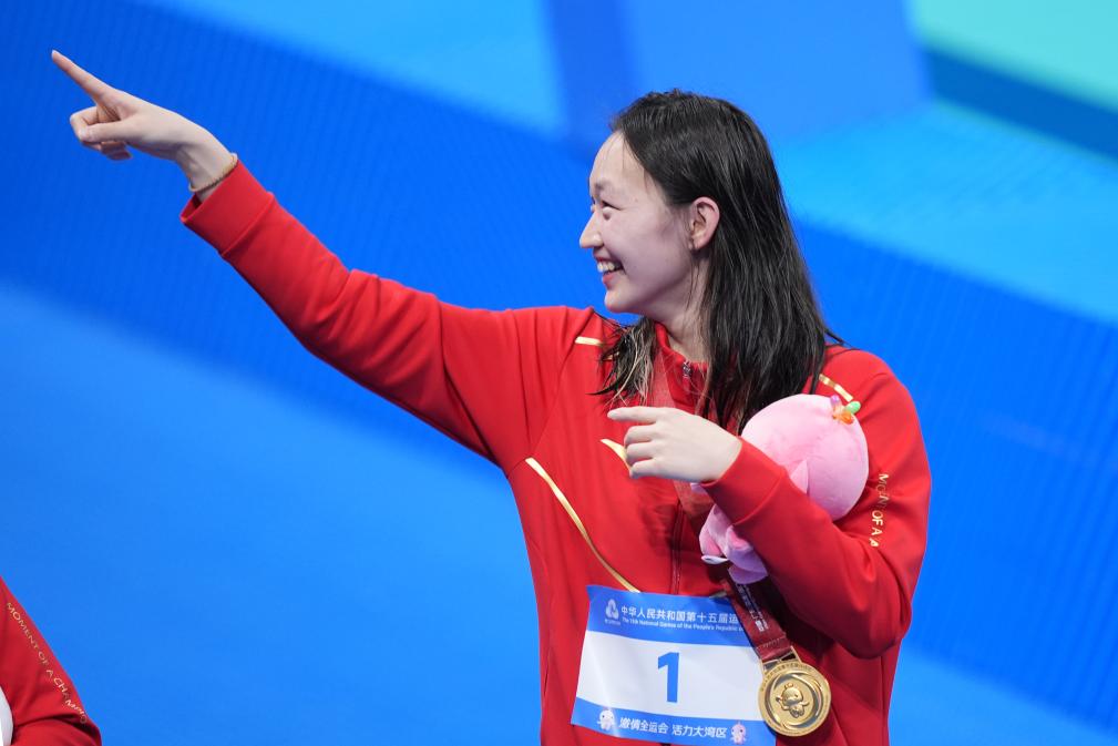 2025年11月16日,获得冠军的河北队选手李冰洁在颁奖仪式后。当日,第十五届全国运动会游泳女子800米自由泳决赛在深圳举行。新华社记者 杜宇 摄