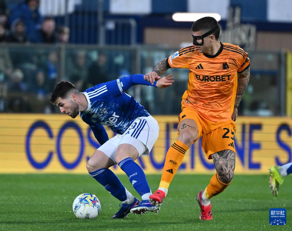 3月15日,罗马队球员曼奇尼(右)与科莫队球员巴图里纳在比赛中拼抢。
