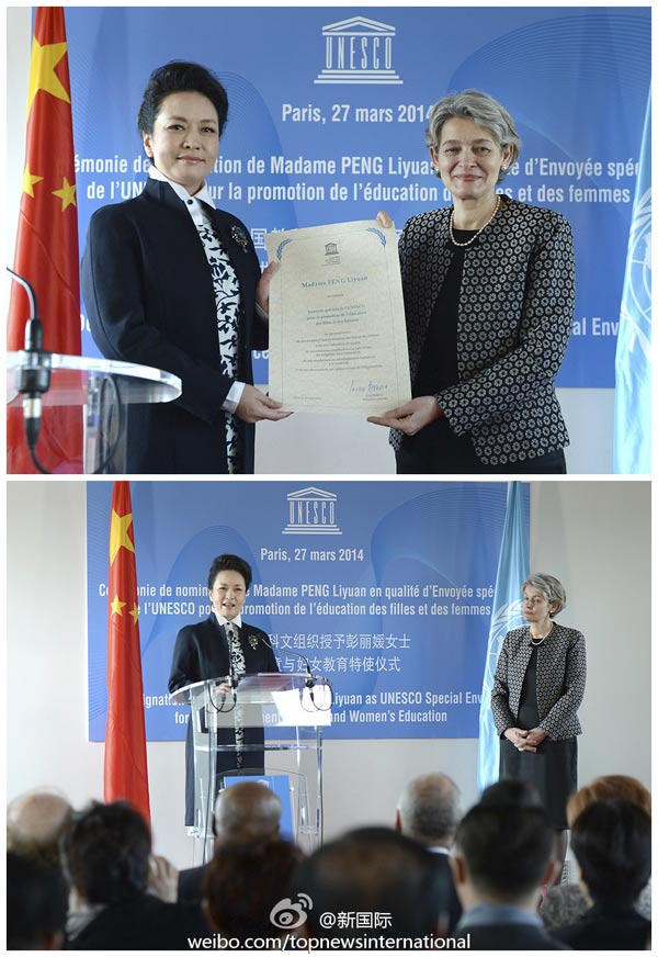 ????新華網(wǎng)北京3月27日電 據(jù)新華社“新國(guó)際”微博報(bào)道,習(xí)近平主席夫人彭麗媛27日在巴黎聯(lián)合國(guó)教科文組織總部被授予“促進(jìn)女童和婦女教育特使”榮譽(yù)稱號(hào)。從博科娃總干事手中接過(guò)證書后,彭麗媛說(shuō),這是一項(xiàng)崇高的事業(yè),我愿意盡我所能,幫助更多孩子,為更多姐妹爭(zhēng)取接受教育的權(quán)利。