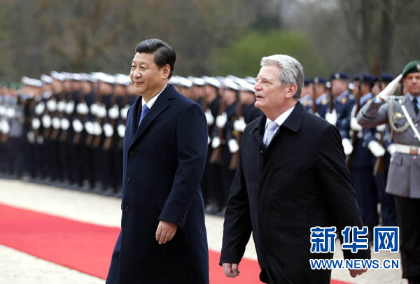 ????3月28日,國家主席習近平在柏林會見德國總統(tǒng)高克。會見開始前,高克在總統(tǒng)府為習近平舉行歡迎儀式。 新華社記者 鞠鵬 攝