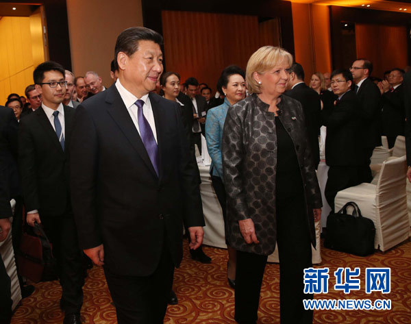 ??? 3月29日,國家主席習(xí)近平在杜塞爾多夫出席中德工商界舉行的招待會并發(fā)表題為《把握中國機遇,實現(xiàn)共同發(fā)展》的重要講話。這是習(xí)近平等步入招待會會場。新華社記者劉衛(wèi)兵攝