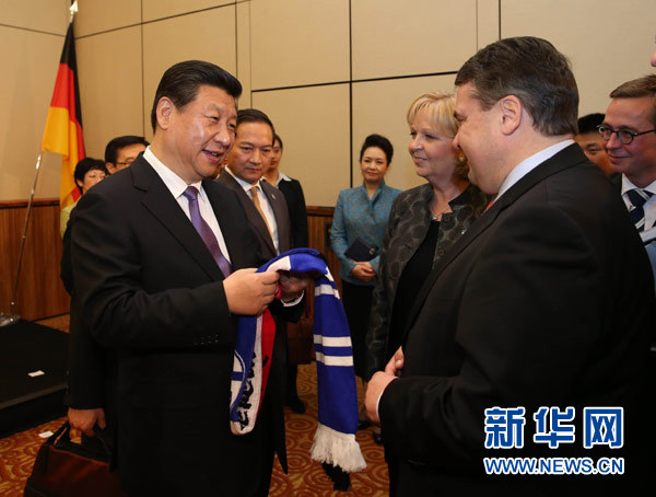 ??? 3月29日,中國國家主席習(xí)近平在杜塞爾多夫出席中德工商界舉行的招待會并發(fā)表題為《把握中國機遇,實現(xiàn)共同發(fā)展》的重要講話。這是招待會開始前,習(xí)近平在會見中德企業(yè)家代表時,德國副總理兼經(jīng)濟和能源部長加布里爾(前右)向習(xí)近平贈送一家德國足球俱樂部球迷標(biāo)志性圍巾。新華社記者劉衛(wèi)兵攝