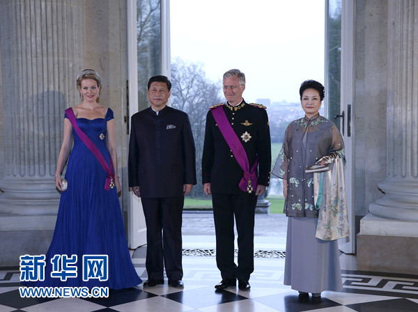 ????3月31日晚,比利時(shí)國王菲利普在布魯塞爾拉肯宮舉行隆重國宴歡迎國家主席習(xí)近平到訪。習(xí)近平和夫人彭麗媛抵達(dá)時(shí),受到菲利普國王和瑪?shù)贍柕峦鹾鬅崆橛印P氯A社記者 龐興雷 攝