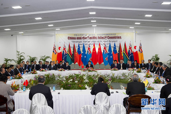 ???? 11月22日,國家主席習(xí)近平在楠迪同斐濟(jì)總理姆拜尼馬拉馬、密克羅尼西亞聯(lián)邦總統(tǒng)莫里、薩摩亞總理圖伊拉埃帕、巴布亞新幾內(nèi)亞總理奧尼爾、瓦努阿圖總理納圖曼、庫克群島總理普納、湯加首相圖伊瓦卡諾、紐??偫硭忍窖髰u國領(lǐng)導(dǎo)人舉行集體會(huì)晤。習(xí)近平主持會(huì)議并發(fā)表主旨講話。新華社記者 饒愛民攝