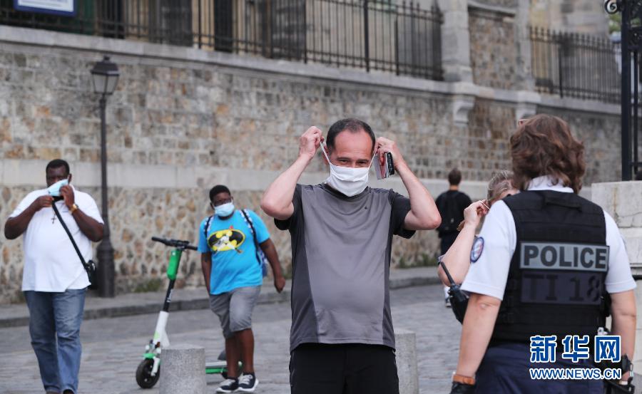 8月10日上午,警察在法國巴黎蒙馬特高地提醒市民佩戴口罩。新華社記者 高靜 攝
