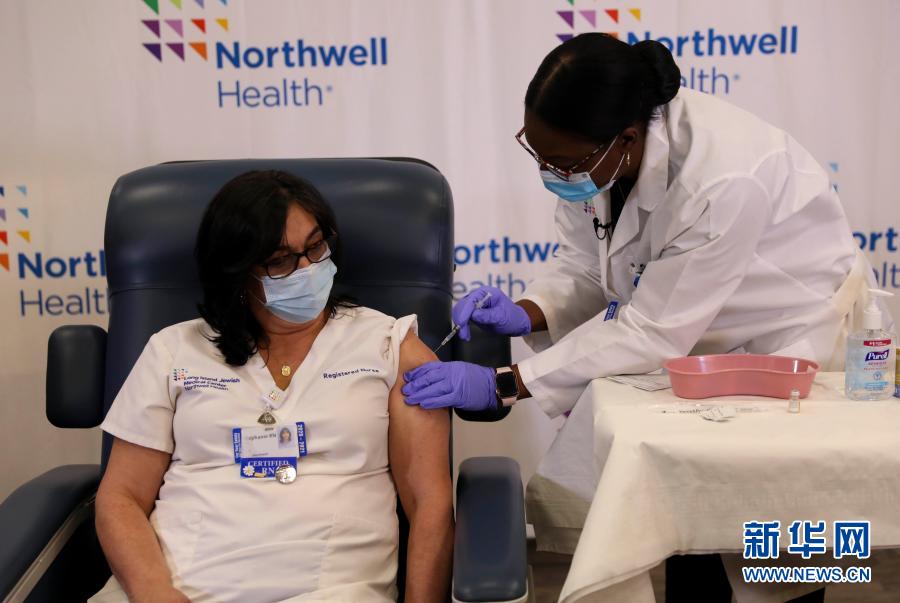 12月14日,在美國(guó)紐約長(zhǎng)島猶太醫(yī)療中心,護(hù)士斯蒂芬妮·凱爾(左)接種新冠疫苗。新華社記者王迎攝