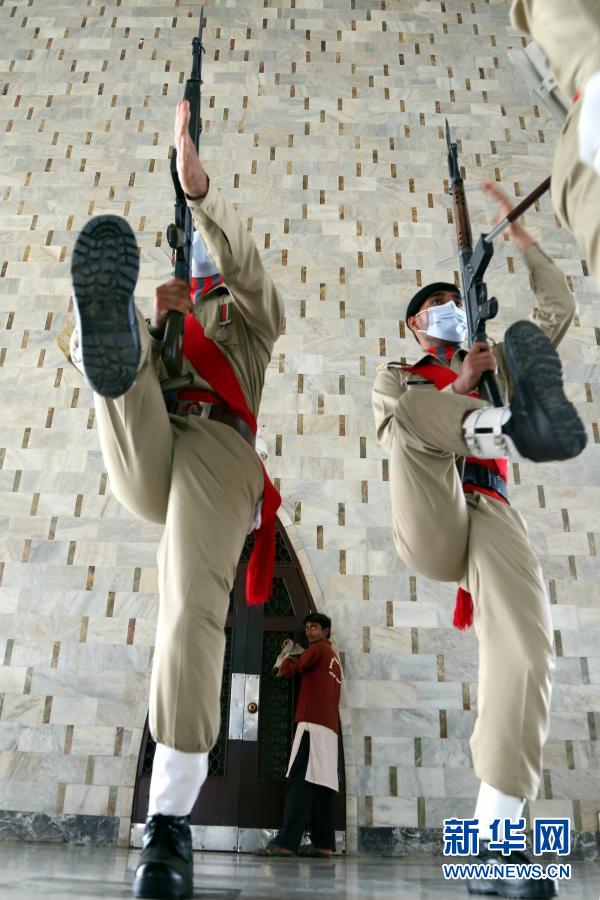 3月23日,巴基斯坦軍人在位于卡拉奇的國父真納墓參加“巴基斯坦日”紀(jì)念活動。